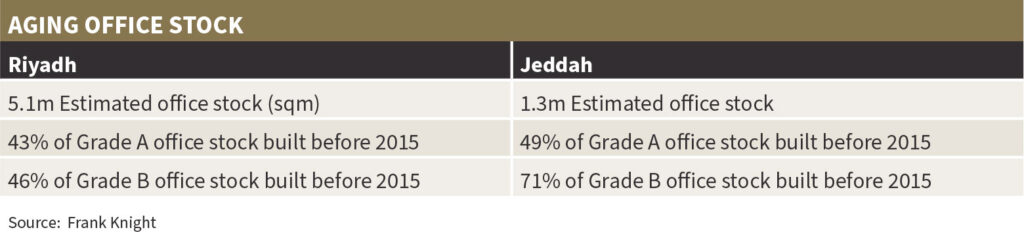 Durrani adds: “In Riyadh and Jeddah, the abundance of aging office stock presents a unique opportunity for developers and landlords to breathe new life into their properties while aligning with sustainability goals. Renovation and modernization, adaptive reuse with green principles, and even demolition and reconstruction are options to be considered, albeit the latter options come with a higher carbon footprint than refurbishing.”