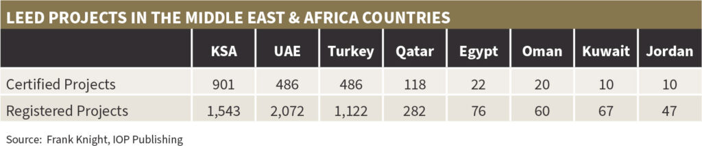 While Saudi Arabia’s 58.4% success rate in LEED certification highlights the proportion of projects meeting stringent requirements for sustainable design, construction, and operation set by LEED, the United Arab Emirates (UAE) leads among Middle Eastern countries with 2,072 LEED registered projects.