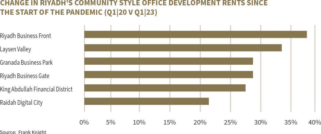 In light of these trends, international blue-chip businesses with extensive sustainability initiatives are particularly interested in ESG-rated assets. Occupying such buildings allows them to showcase their commitment to sustainability, fulfil corporate social responsibility, and attract and retain top talent. In Riyadh, developments like Business Front, King Abdullah Financial District, Laysen Valley, and Business Gate command the highest rental rates, reflecting the growing demand for new or modern developments with a strong focus on community living and ESG aspects.
