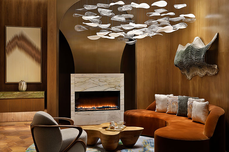 Kristina Zanic: The hotel has several eye-catching and distinct features. The luxurious vibe is set right from the entrance, with a lavishly decorated double-height lobby. A sculptural staircase with a minimal sinuous form conveys a sense of modern luxury. The statement chandeliers in the lobby and function areas also add to the grandeur, showcasing graceful flowing forms and intricate glass ‘leaves’.